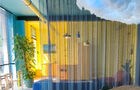 Achter de inbetween-gordijnen bevindt zich de lange houten tafel en het plug&play 65 inch scherm met videoconference-functie en helder geluid.