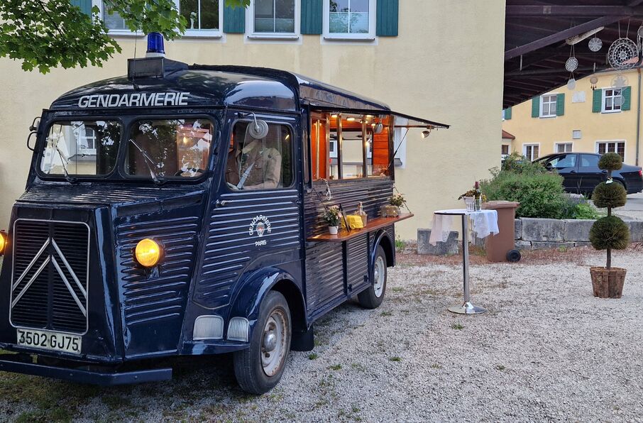Onze liefdevol omgebouwde Citroën Type H in charmante Gendarmerie-retrostijl is de ideale verkoop- of distributiestand.