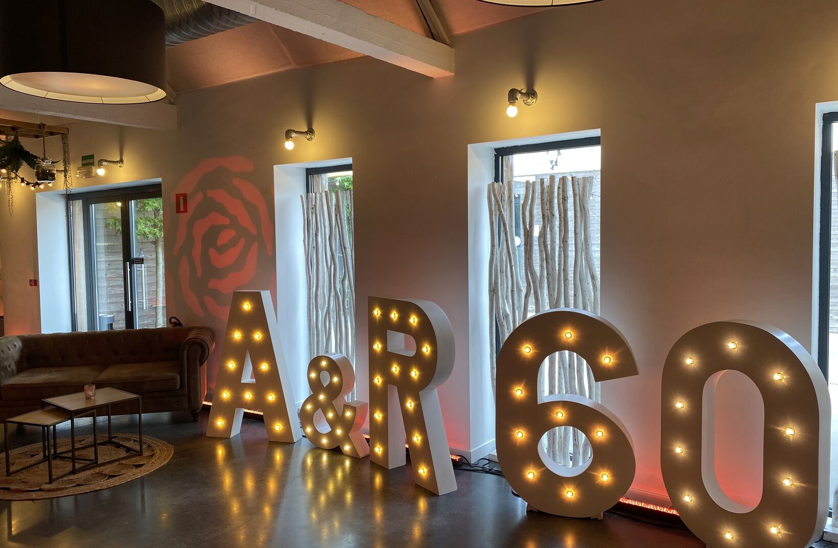 Voor de zestigste huwelijksverjaardag van André en Rachel zorgden we voor deze opstelling met een combinatie van klassiek zitten (crossbacks en ronde tafels), statafels met barkrukken en velvet lounge. Roos was de richtkleur.