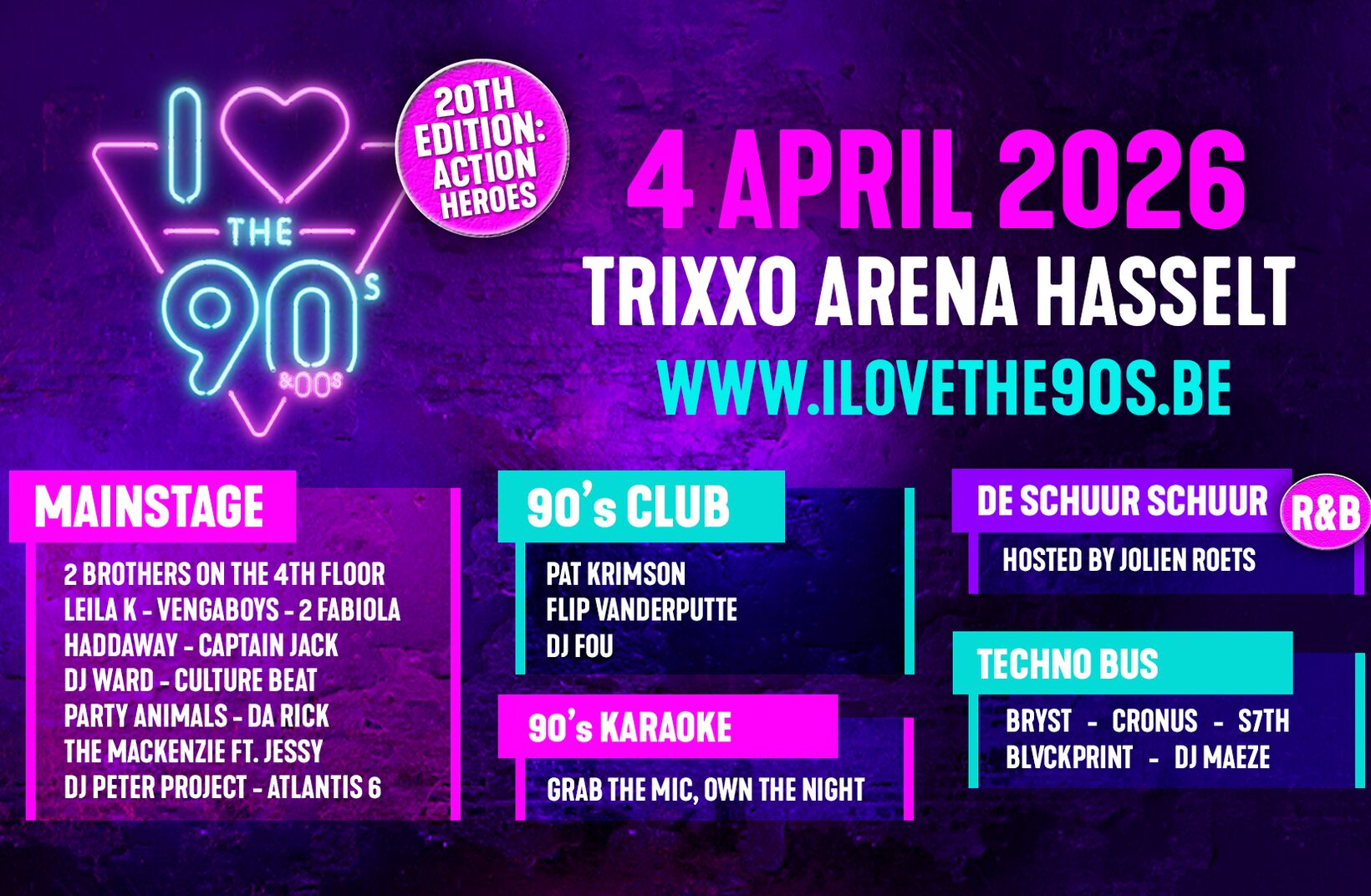 Op zaterdag 4 april 2026 smijt Trixxo Arena Hasselt de gates wagenwijd open voor de 20ste editie van ‘I love the 90s – The party’. Een mijlpaal die om een extra feestelijke aanpak vraagt en daarom wordt er uitgepakt met gloednieuwe stages en partyzones (o.a. 90’s Karaoke, 'De schuur Schuur' (90’s R&B), Techno Bus,…), een heerlijk action heroes thema, extra focus op beleving en een moddervette line-up.