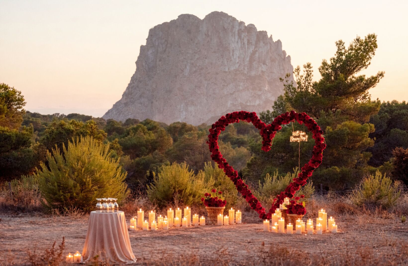 Wij bieden een prachtig, groot rood rozenhart op een unieke, privé locatie in een weiland tegenover Es Vedrà… een plek waar rust, natuur en romantiek samenkomen 🌿